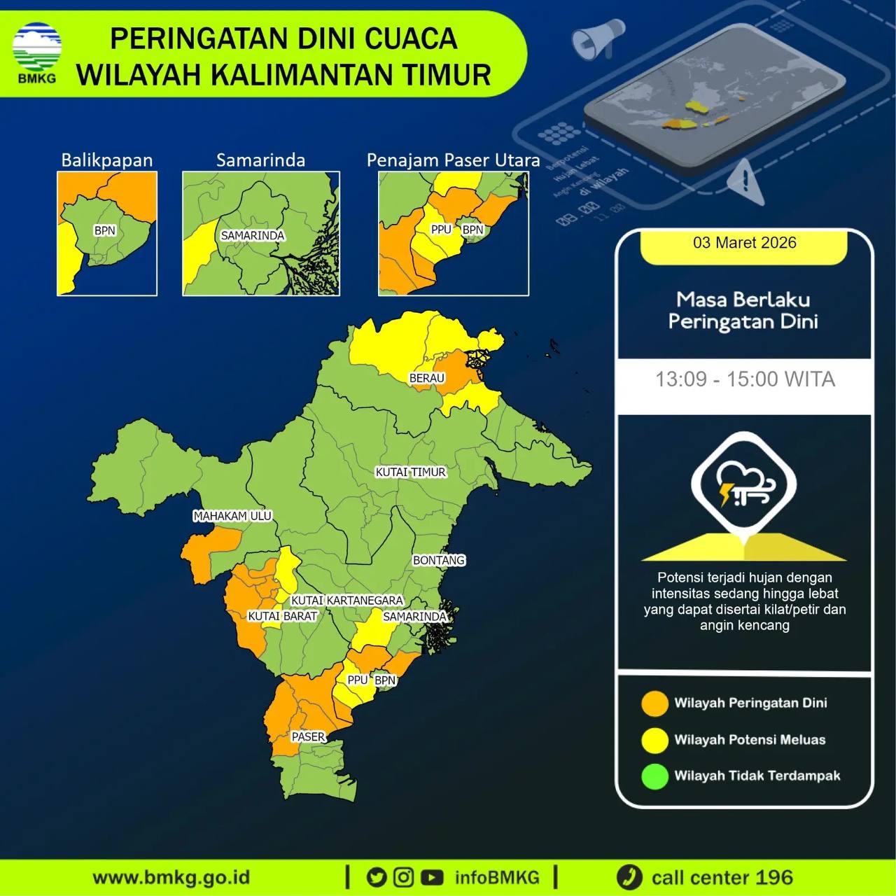 Dalam rincian prakiraan cuaca, Balikpapan diprediksi cerah berawan pada siang hari, Samarinda berawan lalu berpeluang hujan ringan pada malam hari, sedangkan Penajam dan Bontang relatif lebih stabil. Sementara itu, Sendawar menjadi wilayah yang paling perlu dicermati karena pada siang hari berpotensi hujan petir, disusul kondisi kabut pada dini hari.