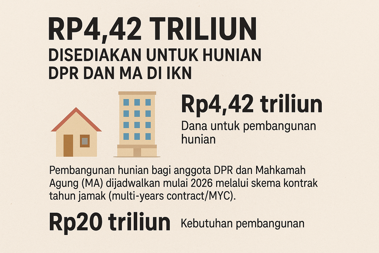 NUSANTARA — Otorita Ibu Kota Nusantara (IKN) mengajukan tambahan anggaran sebesar Rp14,92 triliun kepada pemerintah pusat. Dari jumlah tersebut, sekitar Rp4,42 triliun dialokasikan khusus untuk pembangunan hunian anggota DPR RI dan Mahkamah Agung (MA) yang dijadwalkan mulai 2026 melalui skema kontrak tahun jamak (multi-years contract/MYC).